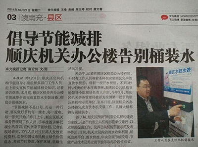 新疆烏市、四川南充等地政府機(jī)關(guān)辦公樓已開(kāi)展節(jié)約型公共機(jī)構(gòu)示范單位建設(shè),以點(diǎn)帶面促進(jìn)工作,發(fā)揮公共機(jī)構(gòu)節(jié)能示范及表率工作。艾迪衛(wèi)節(jié)能直飲水設(shè)備有幸參與到節(jié)能減排直飲水設(shè)備安裝項(xiàng)目中,并試點(diǎn)成功,為國(guó)家的節(jié)能減排工作盡一份綿薄之力?。ㄈ缦聢D為安裝現(xiàn)場(chǎng))